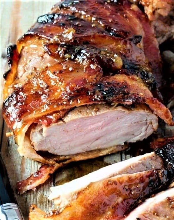 Bacon-wrapped, balsamic-glazed, and finished with honey and mustard — this pork tenderloin is exactly as good as it sounds, and it comes together in under 45 minutes start to finish. The Baklouti Green Chili Fused Olive Oil adds a subtle heat to the sear, the Lavender Dark Balsamic brings a floral complexity to the glaze that's genuinely unexpected, and the bacon does what bacon always does. This is the kind of weeknight dinner that makes people think you've been cooking all afternoon.